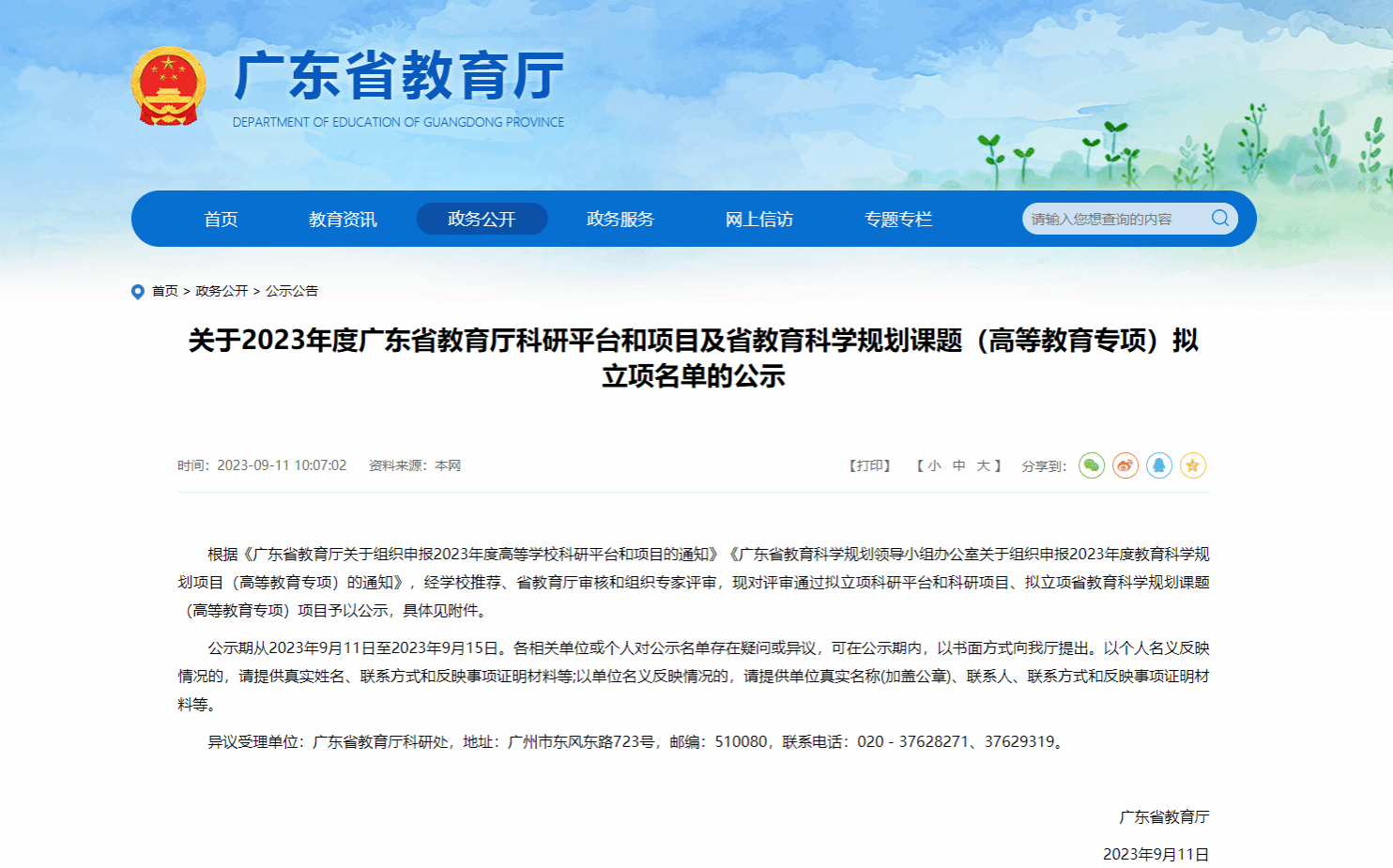 近日,2023年度广东省教育厅科研平台和项目及省教育科学规划课题(高等教育专项)拟立项名单公示,海角社区