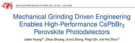 论文题为“Mechanical Grinding Driven Engineering Enables High-Performance CsPbBr3 Perovskite Photodetectors”(《机械研磨驱动工程实现高性能CsPbBr3钙钛矿光电探测器》)。2021级集成电路方向本科生黄嘉彬同学为论文第一作者,周海特聘教授为通讯作者。