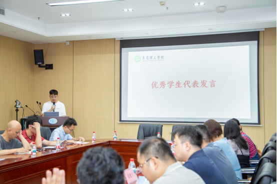 优秀学生代表发言中,戴琛祺同学分享了自己在多元平台历练下的全面成长。通过积极参与学生组织工作、策划组织各类活动以及投身社会实践与志愿服务,他不仅有效提升了沟通协作与组织协调能力,更锤炼了卓越的领导力和高度的社会责任感。卓志坤同学则重点讲述了自己在学术探索与竞赛征途中的突破历程。从初入大学时面对专业基础的差距倍感压力,到锚定目标、潜心钻研,在老师指导和团队协作下,他不仅取得了优异的学业成绩,更在蓝桥杯等学科竞赛中屡获佳绩,实现了从追赶者到领跑者的自我超越。