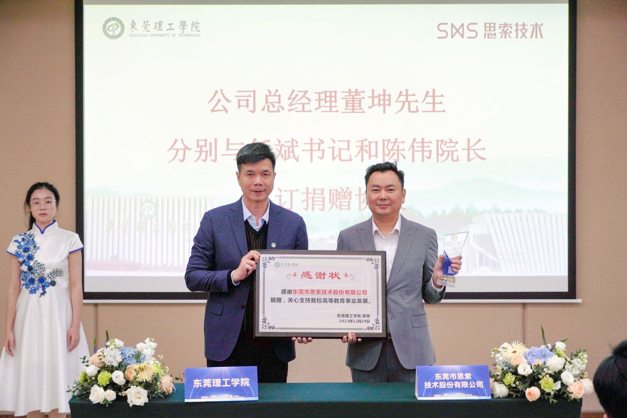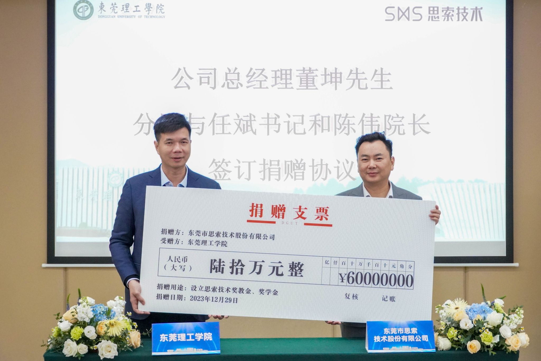 捐赠仪式在松山湖校区会议中心举行。东莞市思索技术股份有限公司总经理董坤、常务副总经理李维国,学校就业创业与校友工作部、教务部、海角社区