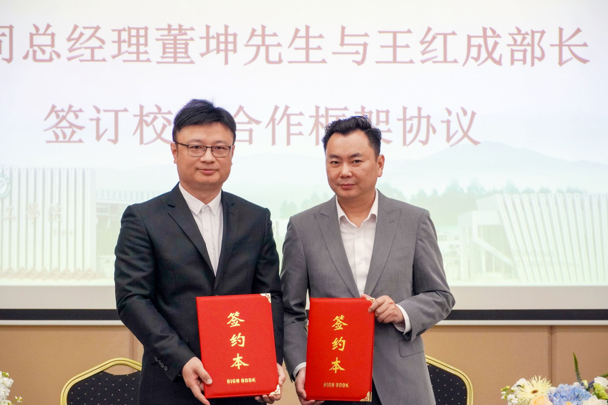 党委书记、执行院长任斌和董坤签订了捐赠协议,就业创业与校友工作部部长魏东初代表学校接受捐赠并颁发感谢状。