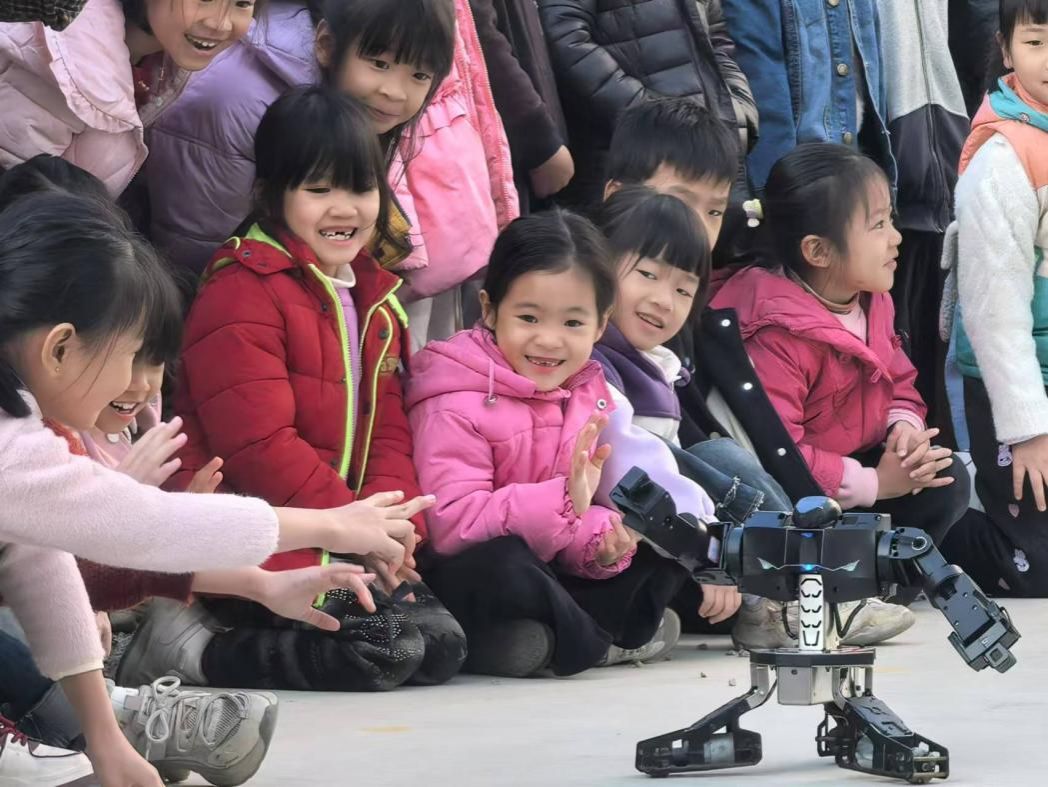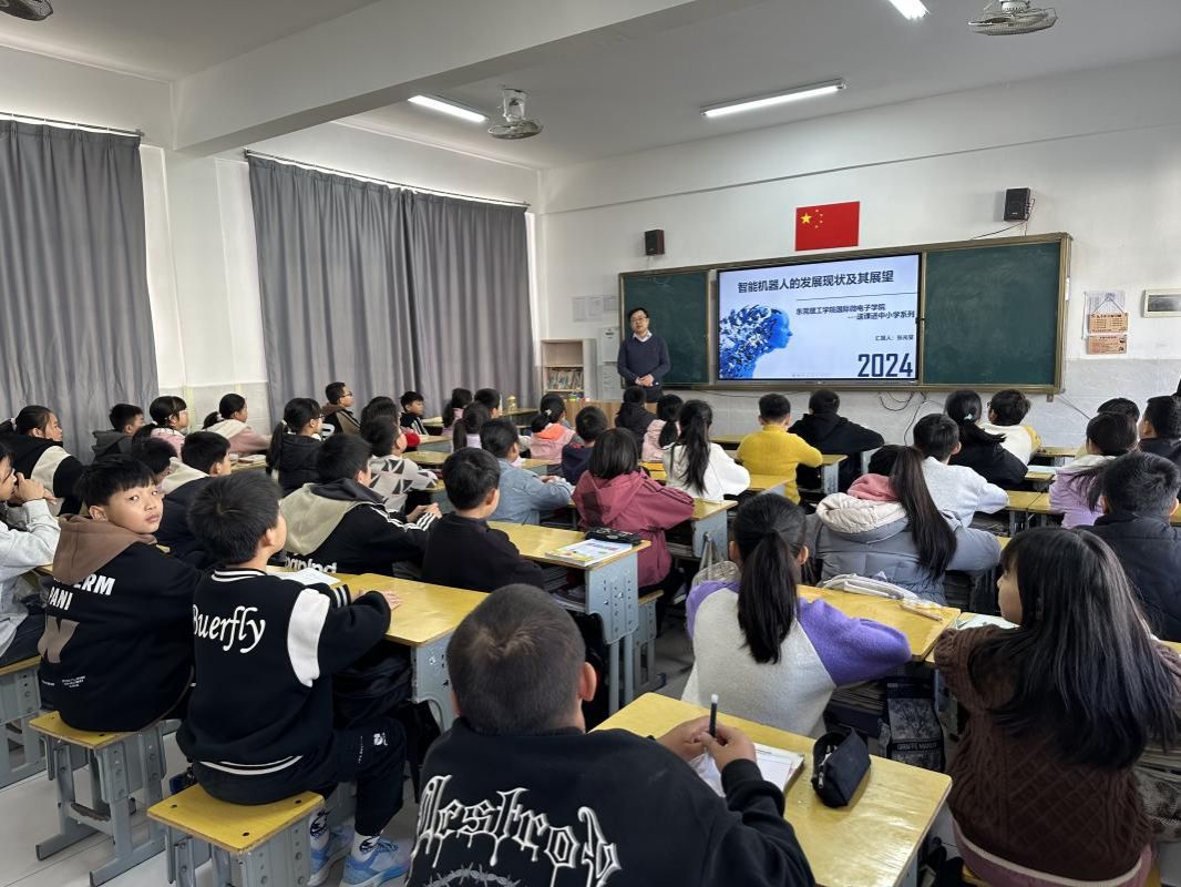 副院长张光旻为岐岗小学的同学们讲了一场生动的机器人科普课,让同学们对机器人的基本知识和工作原理有了一定的认识,随后在操场上进行了机器人的实物展示,进一步激发了同学们浓厚的兴趣,并埋下了一颗求知探索的种子。通过本次教育科普,为乡村振兴和高质量发展贡献“莞工”智慧与力量。