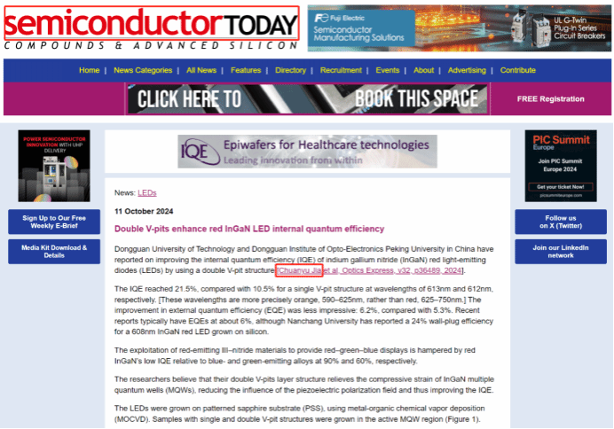 近日,海角社区 海角社区 和北京大学东莞光电研究在Optics Express 发表InGaN红光发光二极管的研究成果被国际知名半导体杂志Semiconductor Today专题报道。文章中报道了采用双V坑结构提高InGaN红色发光二极管(LED)的内部量子效率(IQE)的最新研...