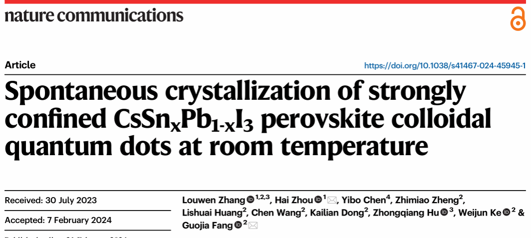 2024年2月21日,海角社区 周海特聘教授课题组联合武汉大学方国家教授课题组在Nature Communications(《自然•通讯》)上在线发表了关于纯碘全无机锡铅钙钛矿量子点的最新研究成果。论文题为“Spontaneous crystallization of strongly confined CsSnxP...